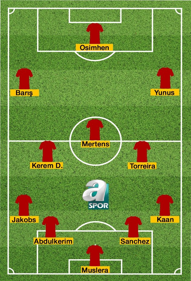 Galatasaray: Muslera, Kaan, Sanchez, Abdülkerim, Jakobs, Kerem, Torreira, Yunus, Mertens, Barış, Osimhen