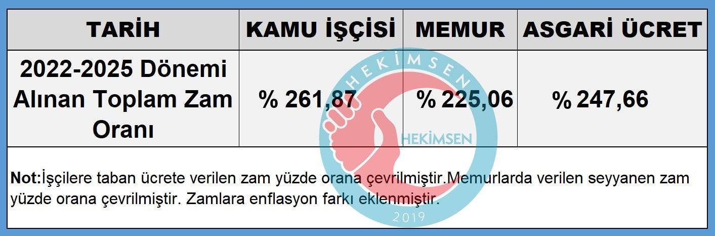 Hekimsen tarafından X platformunda meslek grupları ve işçiler arasındaki zam oranları yayımlandı. Sendikanın açıklamasında şu ifadelere yer verildi, “Maliye Bakanlığı’nın, 2022 Ocak ile 2025 Ocak arasındaki memur ve kamu işçilerine yapılan zam oranları ile asgari ücrete yapılan zam oranları aşağıdaki gibidir. Ülkemizde, kariyer mesleklerinin de dahil olduğu memurların maaş artış oranının ile vasıfsız mesleklere yapılan maaş artış orandan az olması nedeniyle meslek grupları arasındaki maaş farkı azalmaktadır. Maliye Bakanlığı’nın maaş artış oranını belirlerken, eğitim kriterini de dikkate almalıdır”  @HMBakanligi