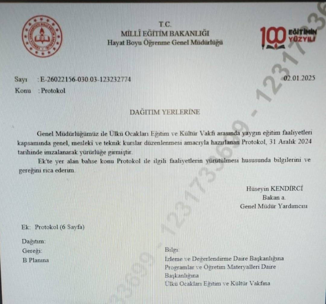 Altı sayfadan oluşan protokolle MHP’ye bağlı Ülkü Ocakları, Türkiye’nin 81 ilinde faaliyet gösteren Hayat Boyu Öğrenme Merkezlerinde kurslar verebileceği bildiriliyor